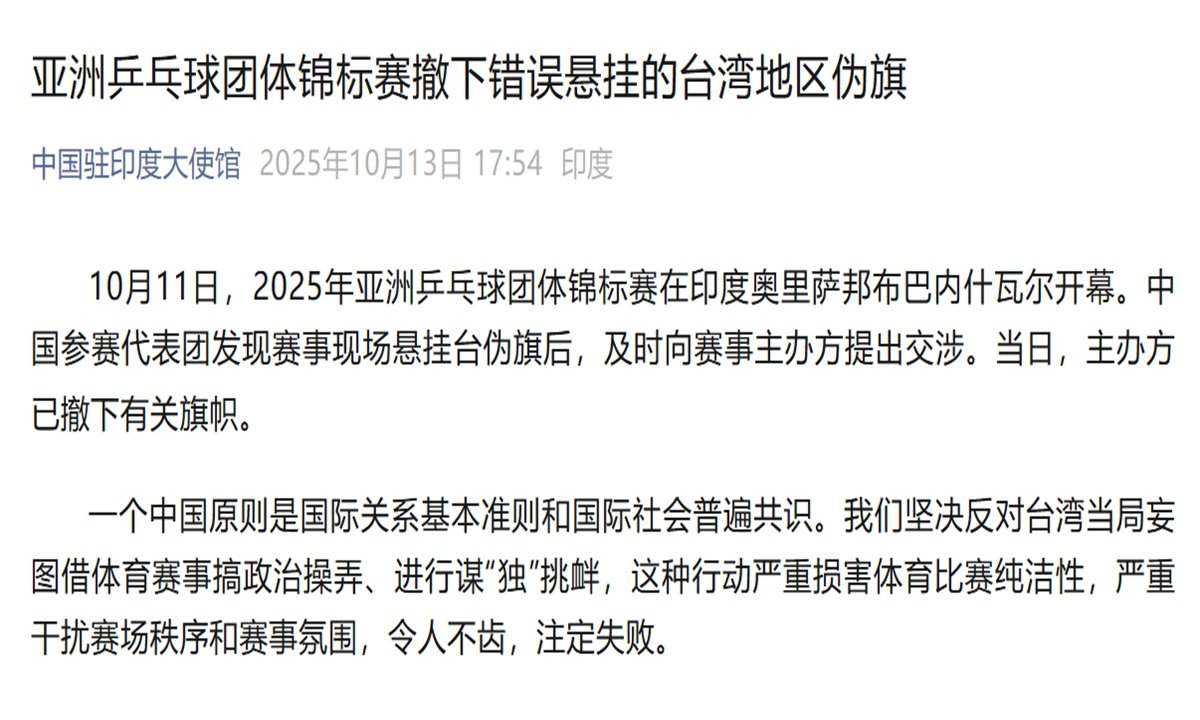 Çin Hükümeti, Hindistan'ın Bhubaneswar kentinde düzenlenen 28. Asya Masa Tenisi Takım Şampiyonası'nda, Çin'in Tayvan bölgesine ait olduğu iddia edilen yanlış bir bayrağın asılması üzerine harekete geçti. Çin delegasyonunun müdahalesiyle organizatörler, söz konusu bayrağı aynı gün içinde kaldırdı.