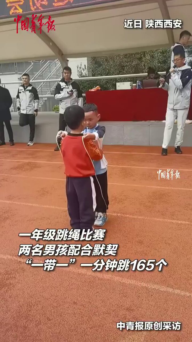 Çin'in Şaanşi Eyaleti'ne bağlı Xi'an kentinde düzenlenen bir ip atlama yarışmasında, birinci sınıf öğrencisi iki erkek çocuğu, izleyenleri hayrete düşüren bir performans sergiledi. Minik sporcular, bir dakika içinde tam 165 kez ip atlamayı başararak mükemmel bir takım çalışması örneği gösterdi.