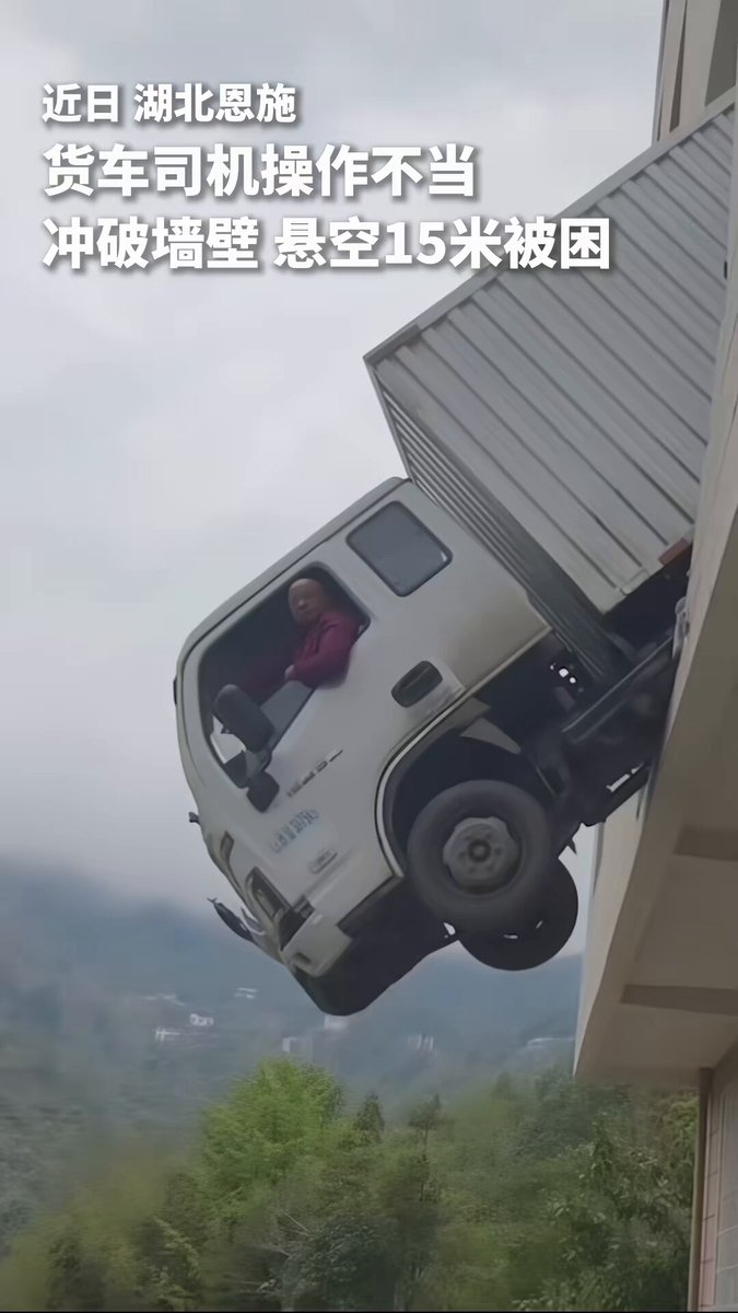 Çin'in Hubei eyaletine bağlı Enshi şehrinde, bir kamyon sürücüsünün hatalı manevrası sonucu yaşanan kaza, nefesleri kesti. Araç, bir binanın ikinci katından 15 metre yükseklikte, adeta havada asılı kaldı.