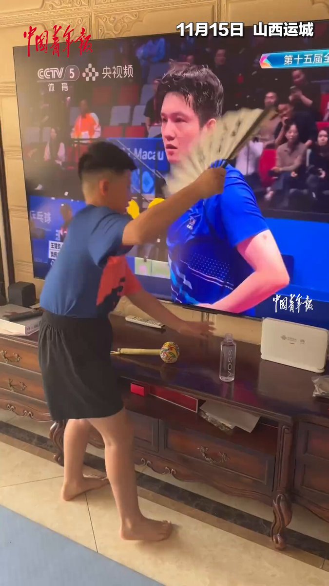Küçük çocuk, televizyonda canlı yayınlanan maç sırasında, Shanghay kentinin Olimpiyat altın madalyası sahibi sporcusu Fan Zhendong'a ekrandan destek vermeye başladı.