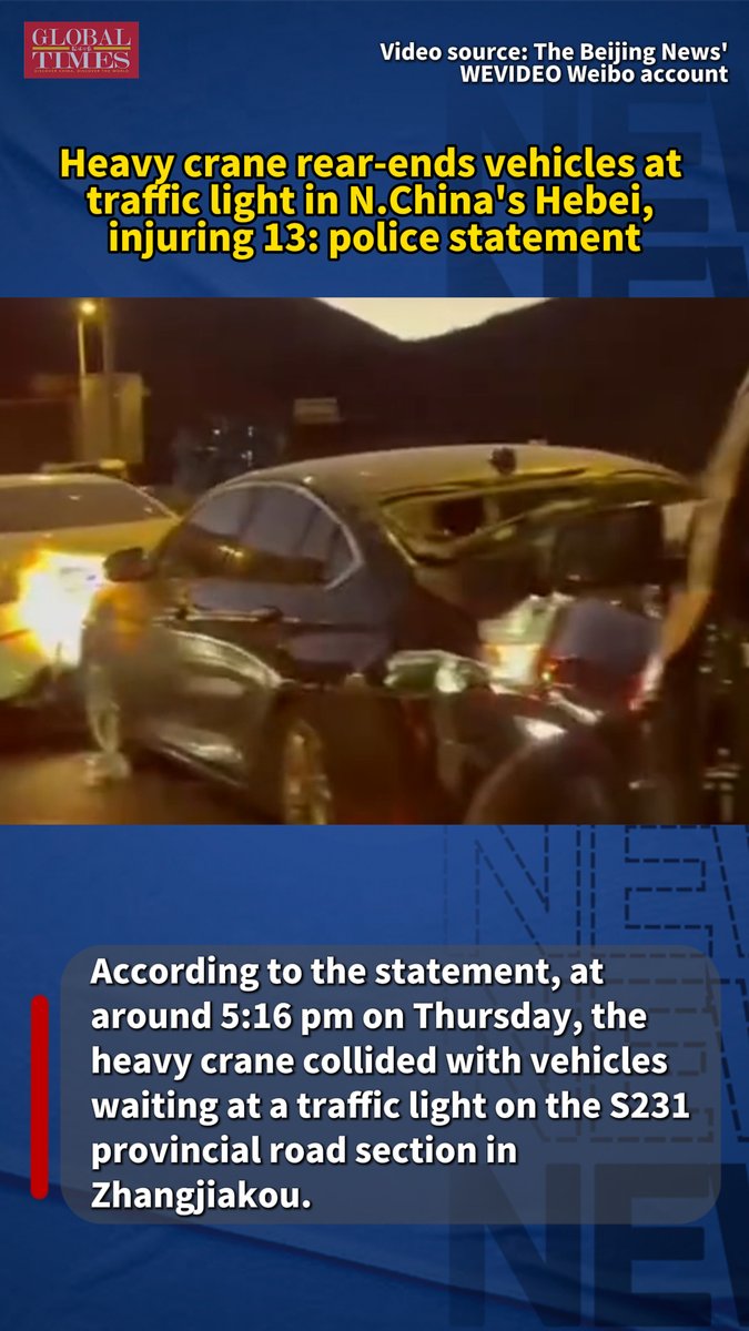 Çin'in Hebei Eyaleti'ne bağlı Zhangjiakou kentinde, kırmızı ışıkta duran araçlara bir ağır vinç kamyonunun arkadan çarpması sonucu 13 kişi yaralandı. Olay, yerel polis tarafından Perşembe gecesi yapılan açıklamayla duyuruldu.