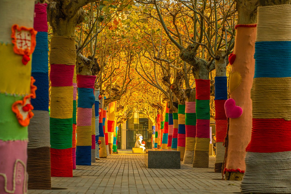 Pekin'in Haidian semtinde, yaklaşık 200 çınar ağacı, rengarenk örgü 'kazaklarla' süslendi. Her biri kendine özgü oyunbaz desenlere sahip olan bu yaratıcı şehir sanatı enstalasyonu, kent peyzajına sıcak ve davetkâr bir dokunuş getiriyor.