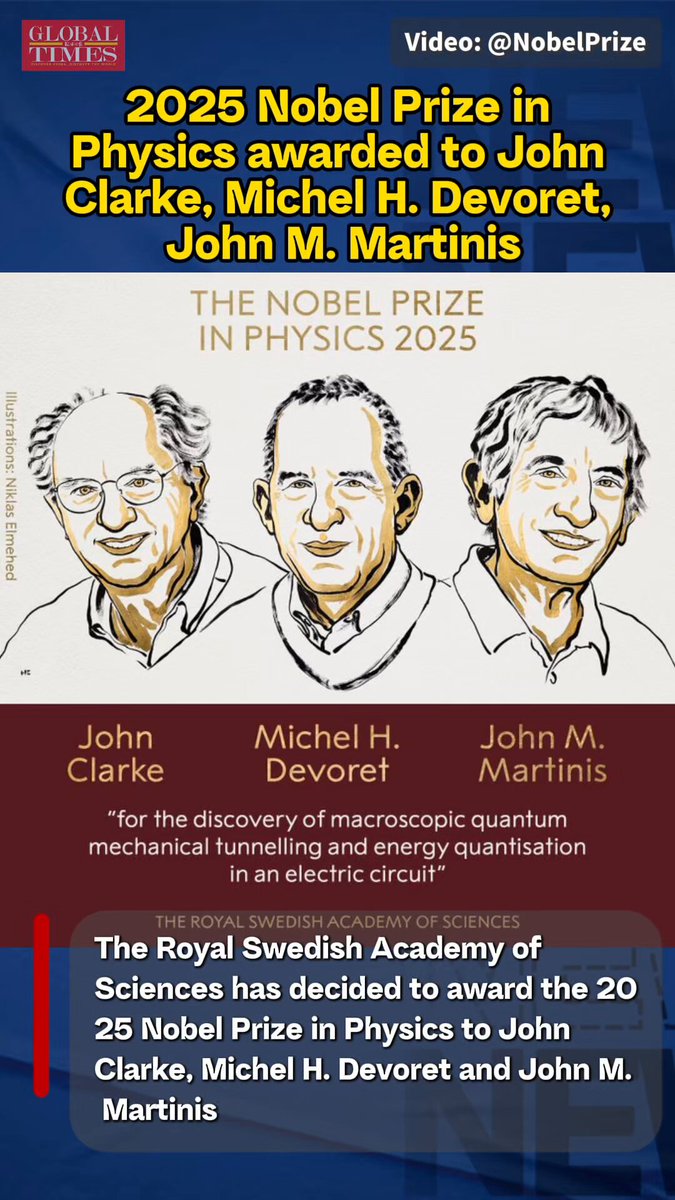 2025 Nobel Fizik Ödülü, John Clarke, Michel H. Devoret ve John M. Martinis'e verildi. Bilim insanları, bir elektrik devresinde makroskobik kuantum mekaniksel tünelleme ve enerji kuantizasyonunun keşfinden dolayı bu prestijli ödüle layık görüldü. Ödülün açıklanması, Nobel Ödülü'nün resmi X hesabı üzerinden duyuruldu.