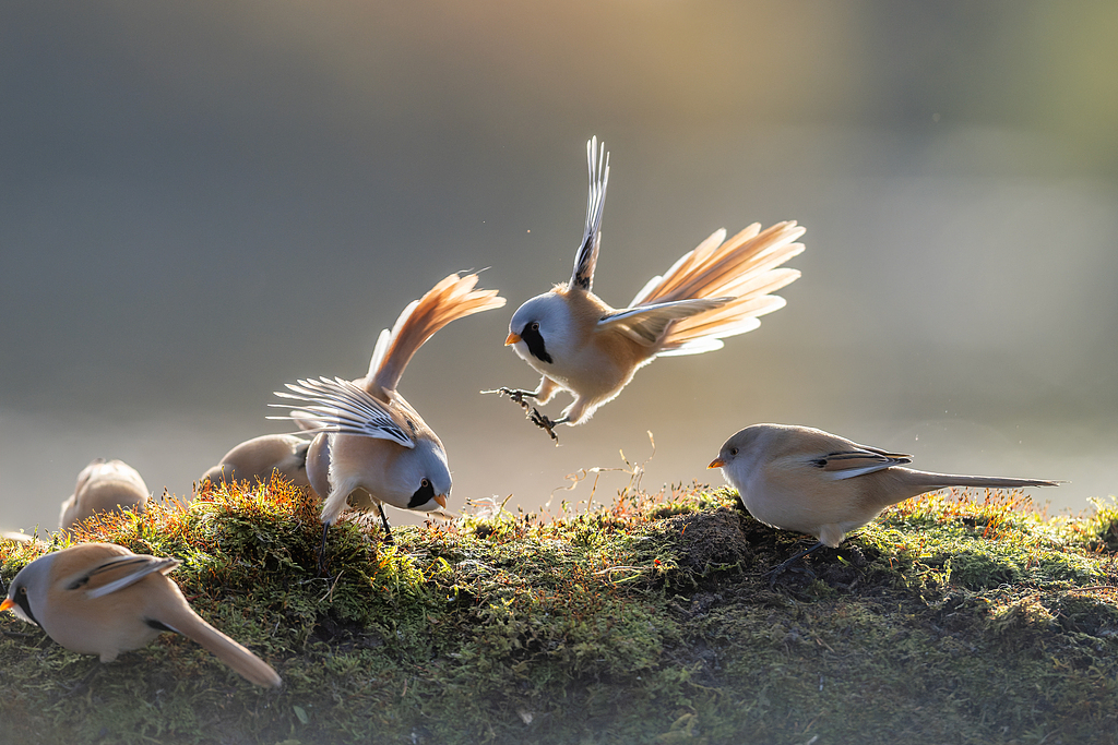 Bıyıklı kamışçınlar, özellikle uzun ve gür bıyığa benzeyen tüyleriyle dikkat çeken küçük, tombul kuşlardır. Bu sevimli kuşlar, sonbahar mevsiminde Longfeng Sulak Alanı'ndaki sazlıklar arasında adeta birer akrobat gibi hareket ediyor. Sazların arasında ustalıkla dans ederek yiyecek arıyor ve oyunlar oynuyorlar.
